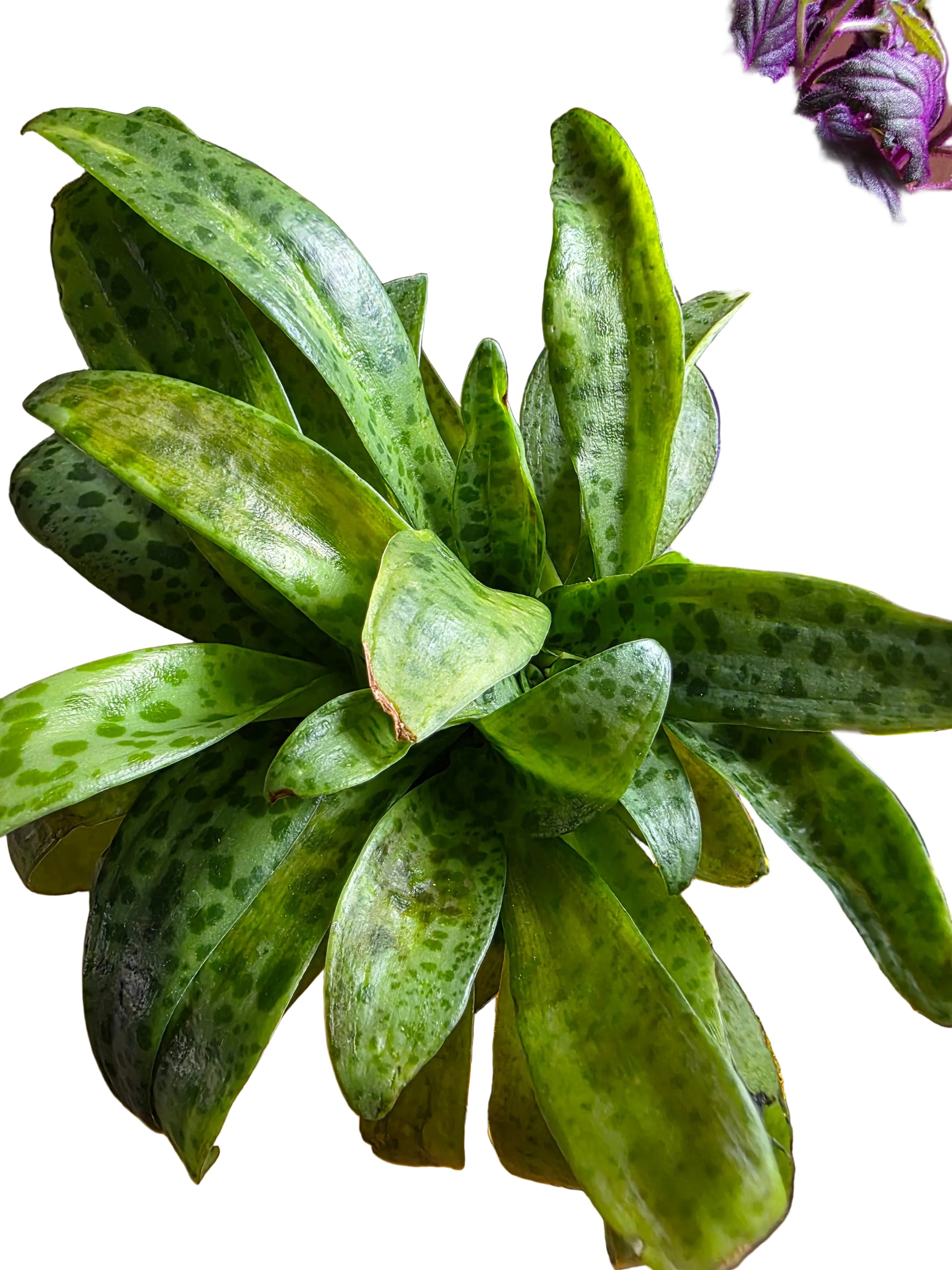 - Follaje: Presenta hojas lanceoladas de textura gruesa, de color verde claro con un patrón de manchas verde oscuro o marrones que recuerdan la piel de un animal.